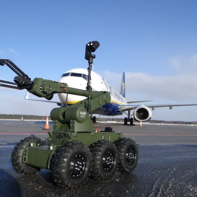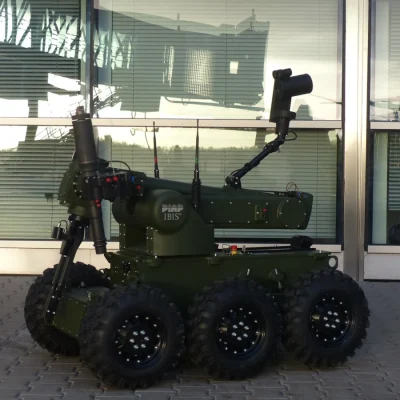 PIAP IBIS® robot de eliminación de artefactos explosivos (EOD) y de reconocimiento. Tras la instalación de dispositivos adicionales, puede ser utilizado, entre otros, para la eliminación de residuos peligrosos, reconocimiento químico u operaciones de rescate. El chasis de seis ruedas con tracción independiente en cada rueda permite al robot operar en terrenos difíciles y diversos (áreas rocosas, humedales, pantanos y escombros).